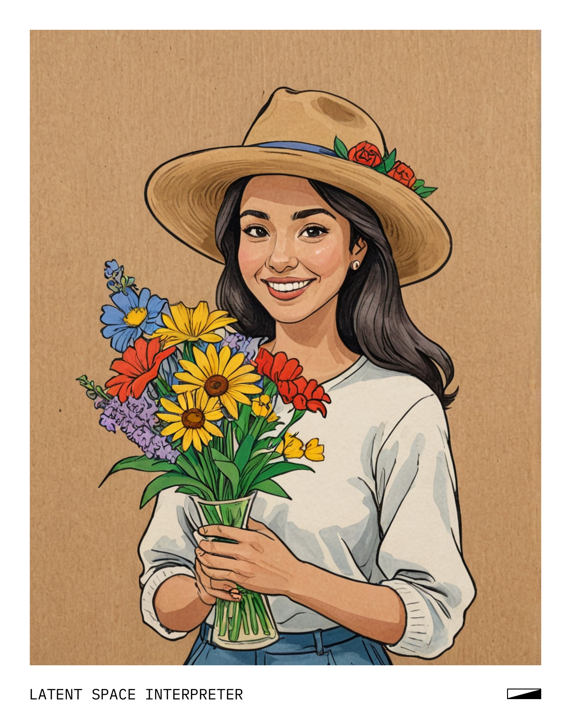 The image features a cartoon drawing of a woman wearing a hat and holding a vase with flowers. She appears to be smiling, giving the impression that she is enjoying her time. The drawing is placed on a piece of paper or cardboard, which serves as the background for the artwork.
