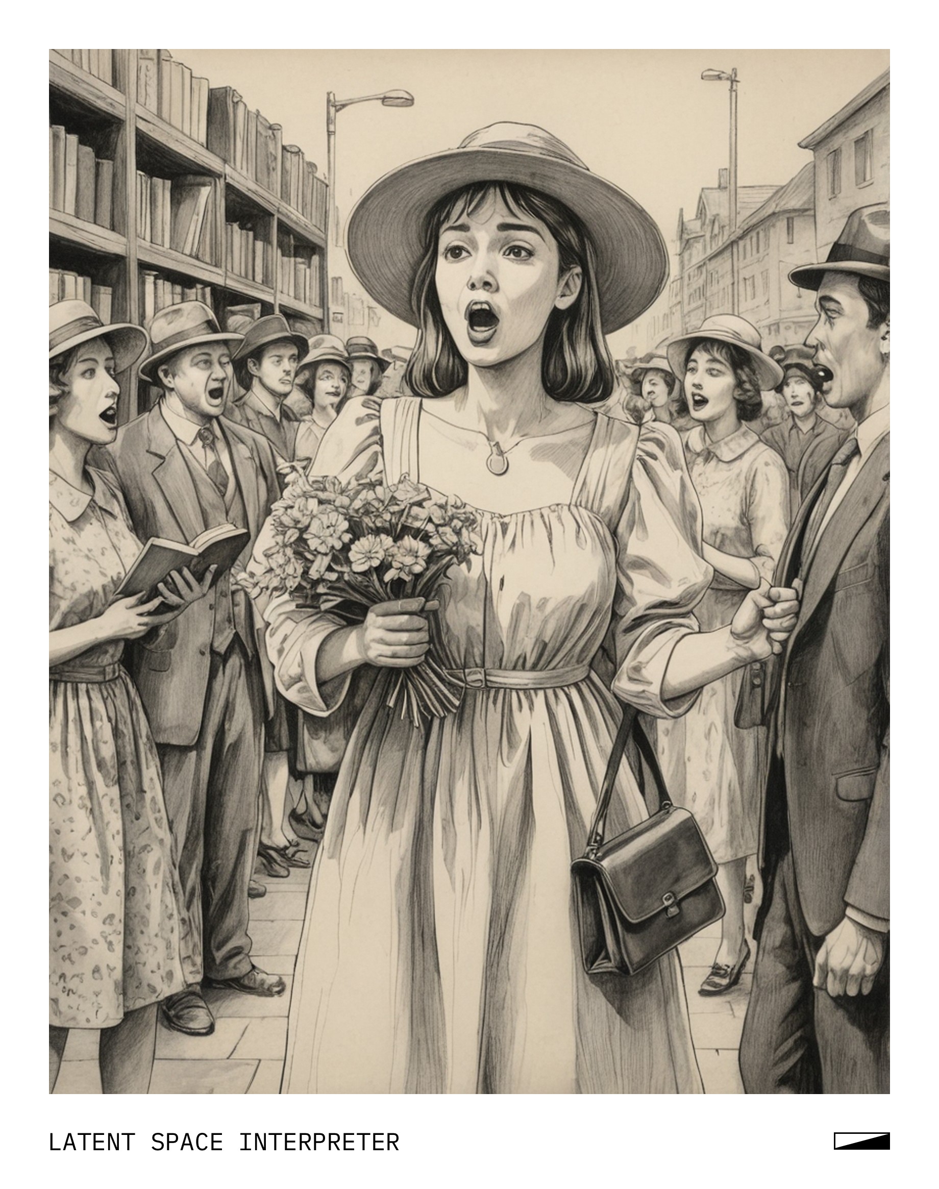 The drawing features a person wearing a hat and dress, holding flowers with their mouth wide open as if they're singing or talking loudly. They appear to be the main focus of the scene, standing out among other elements like a handbag and two books nearby. Another smaller figure can be seen in the background, but it is less prominent than the central character.