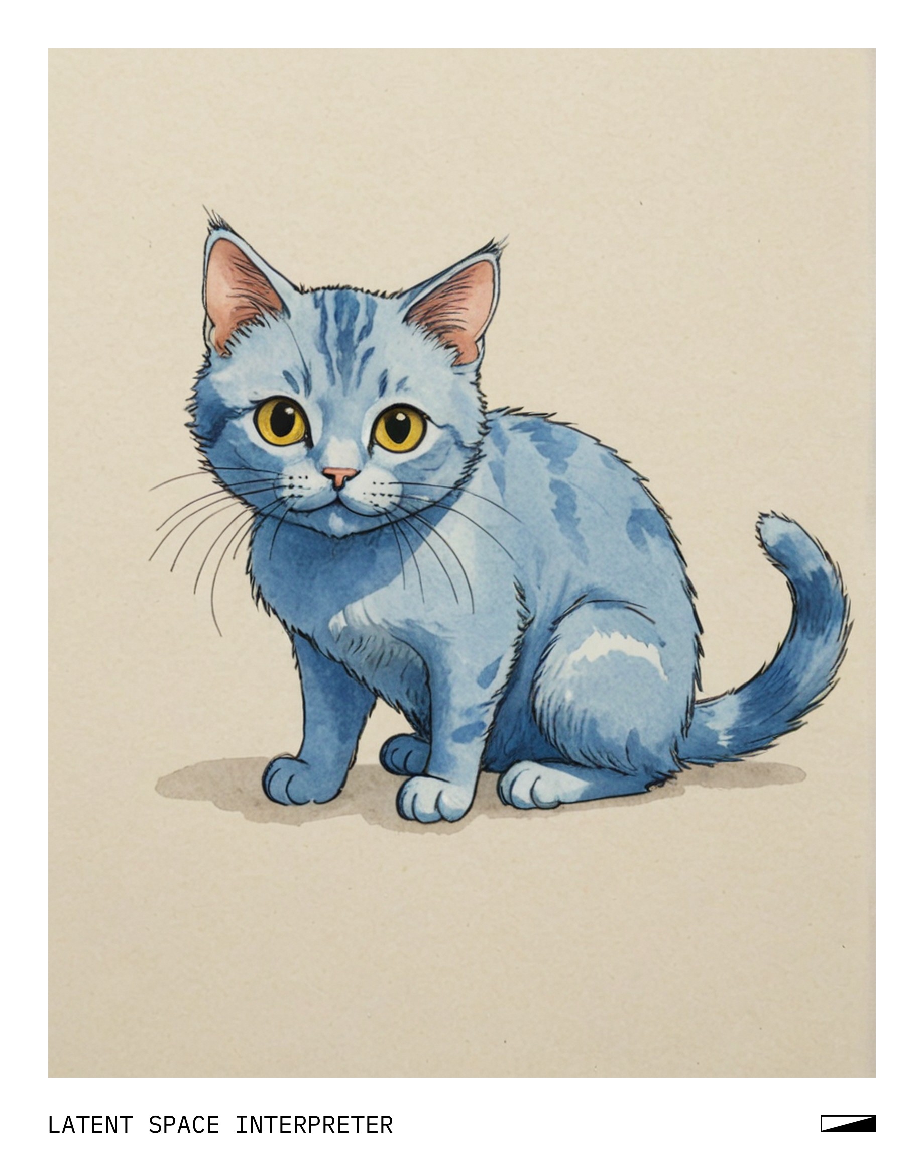The image features a very cute, blue drawing of a cat sitting down with a face on it. It has long whiskers and appears to be the main focus of the scene. In addition to the cat, there is also another smaller cat-like figure towards the left side of the frame, but its details are not as prominently displayed as those of the main cat.