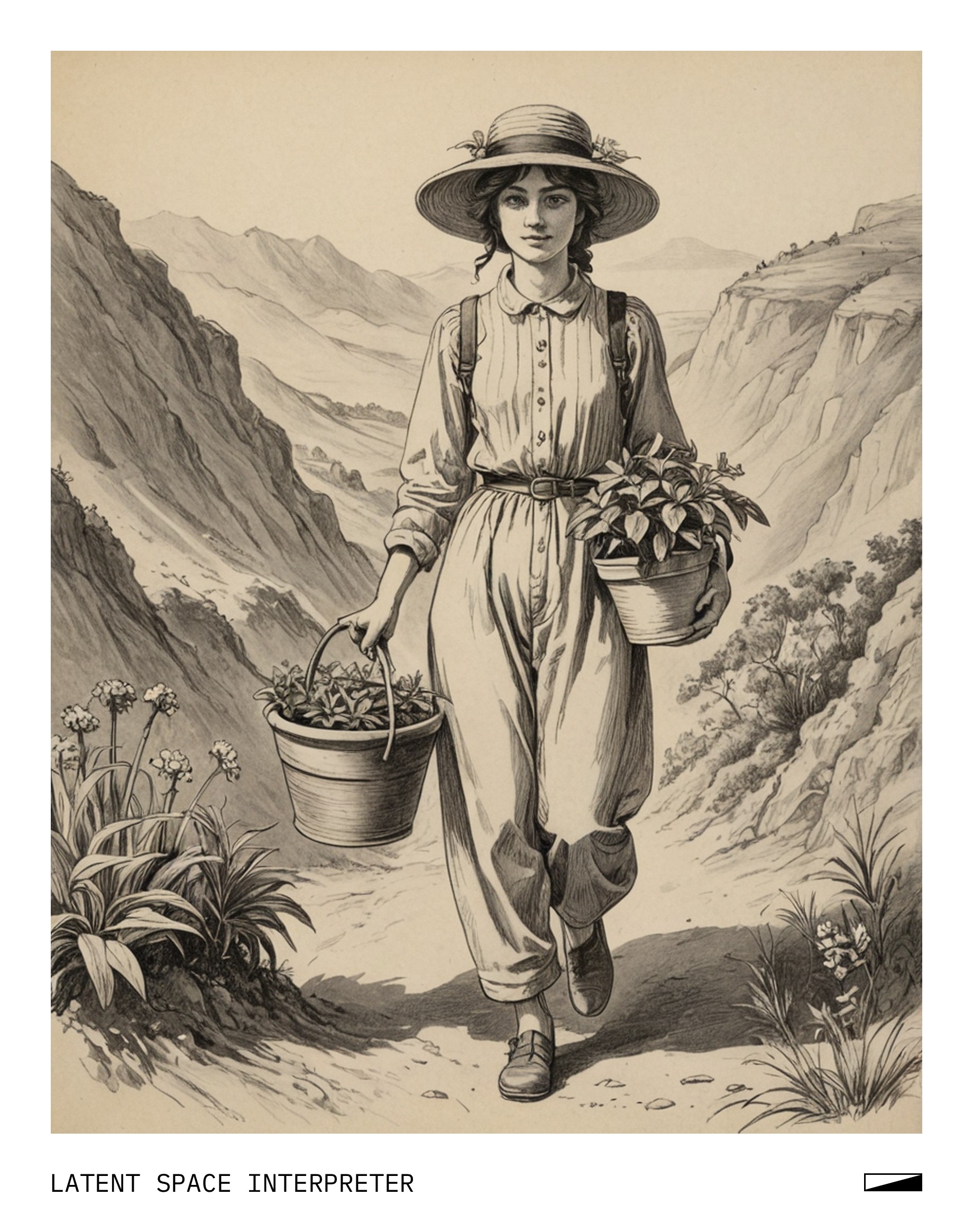 The image features a drawing of a woman holding a potted plant, possibly a flower pot, and wearing a hat. She appears to be carrying the pot down a hill or some other terrain. The drawing is skillfully done, capturing the details of her clothing and accessories.