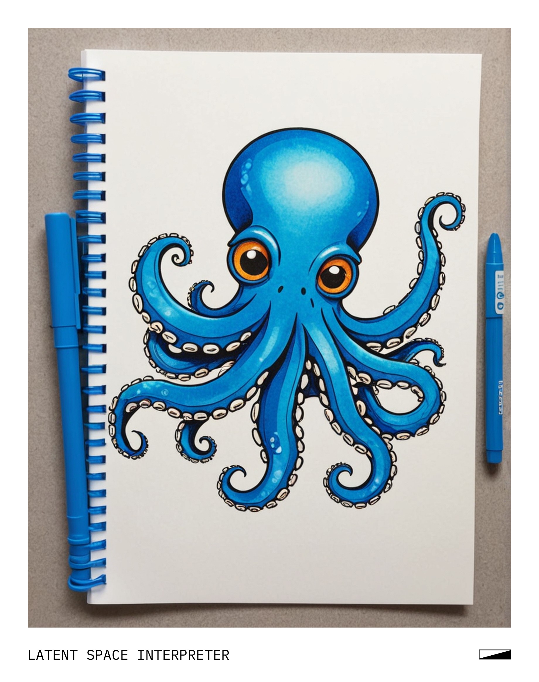 The image features a cartoon octopus drawn with a blue marker on top of a white paper, giving it a very cute appearance. This unique design is positioned next to the camera, and its various tentacles stretch out from the center towards different parts of the paper. The drawing has been skillfully executed, capturing the playful essence of the octopus's design.