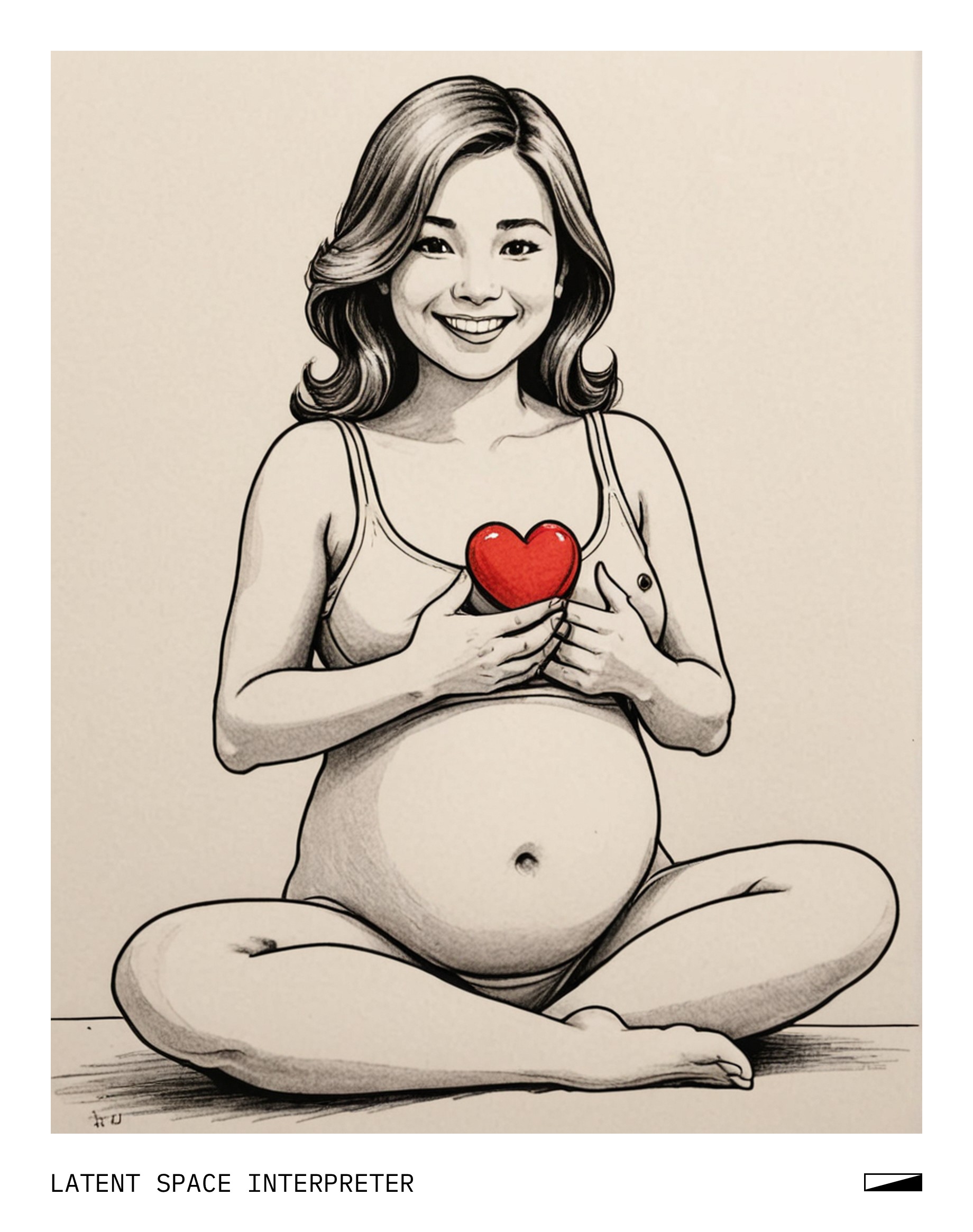 The image features a cartoon drawing of a woman with a pregnant belly, sitting down and smiling. She is holding a heart in her hand, which adds to the warmth of the scene. The drawing appears to be done by hand, giving it a unique and personal touch.