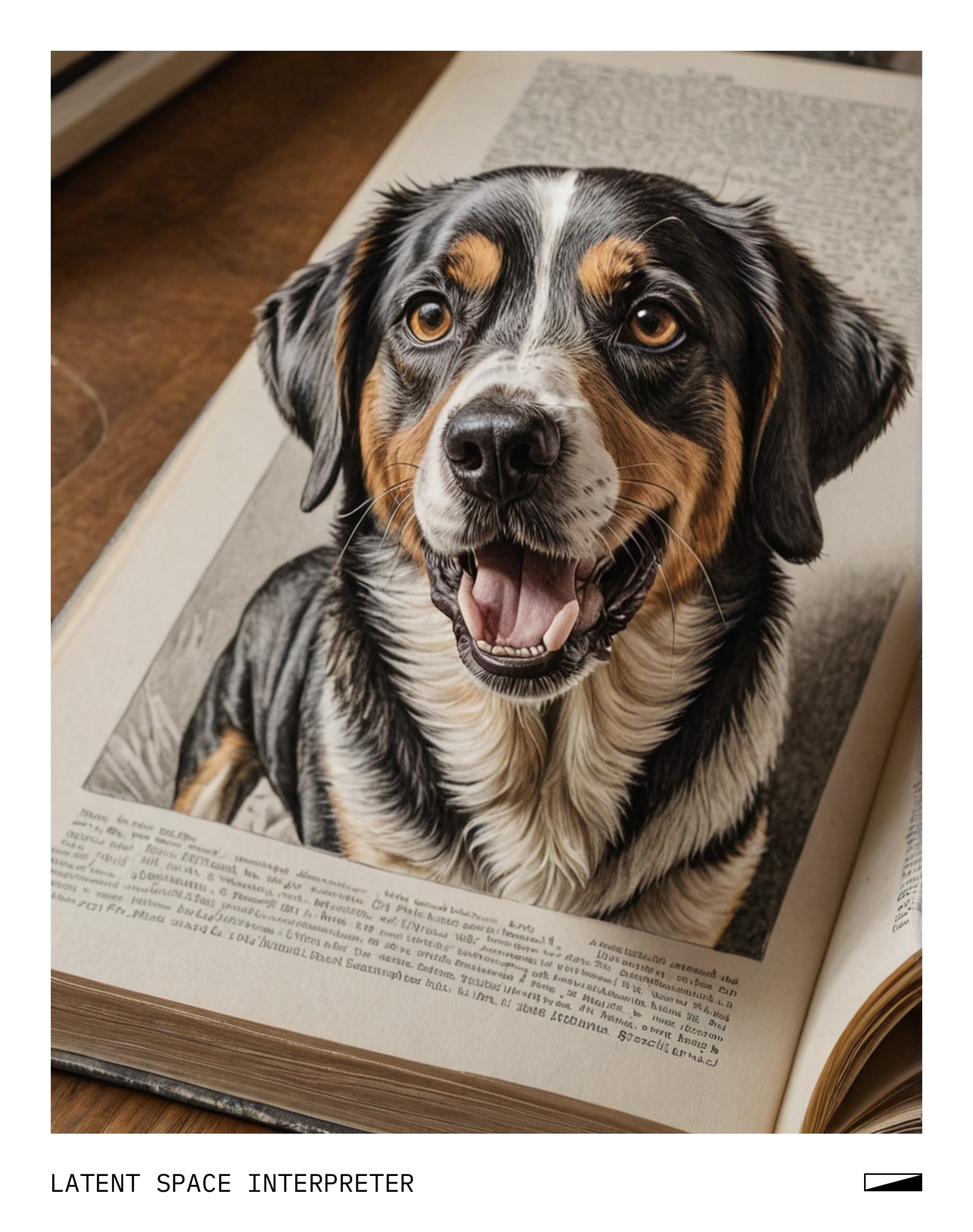 The image features a large, detailed drawing of a dog on the side of a book or paper. The dog appears to be looking at something with its mouth open, giving it a somewhat surprised expression. The drawing is quite intricate and captures the essence of the dog's facial features and body structure.