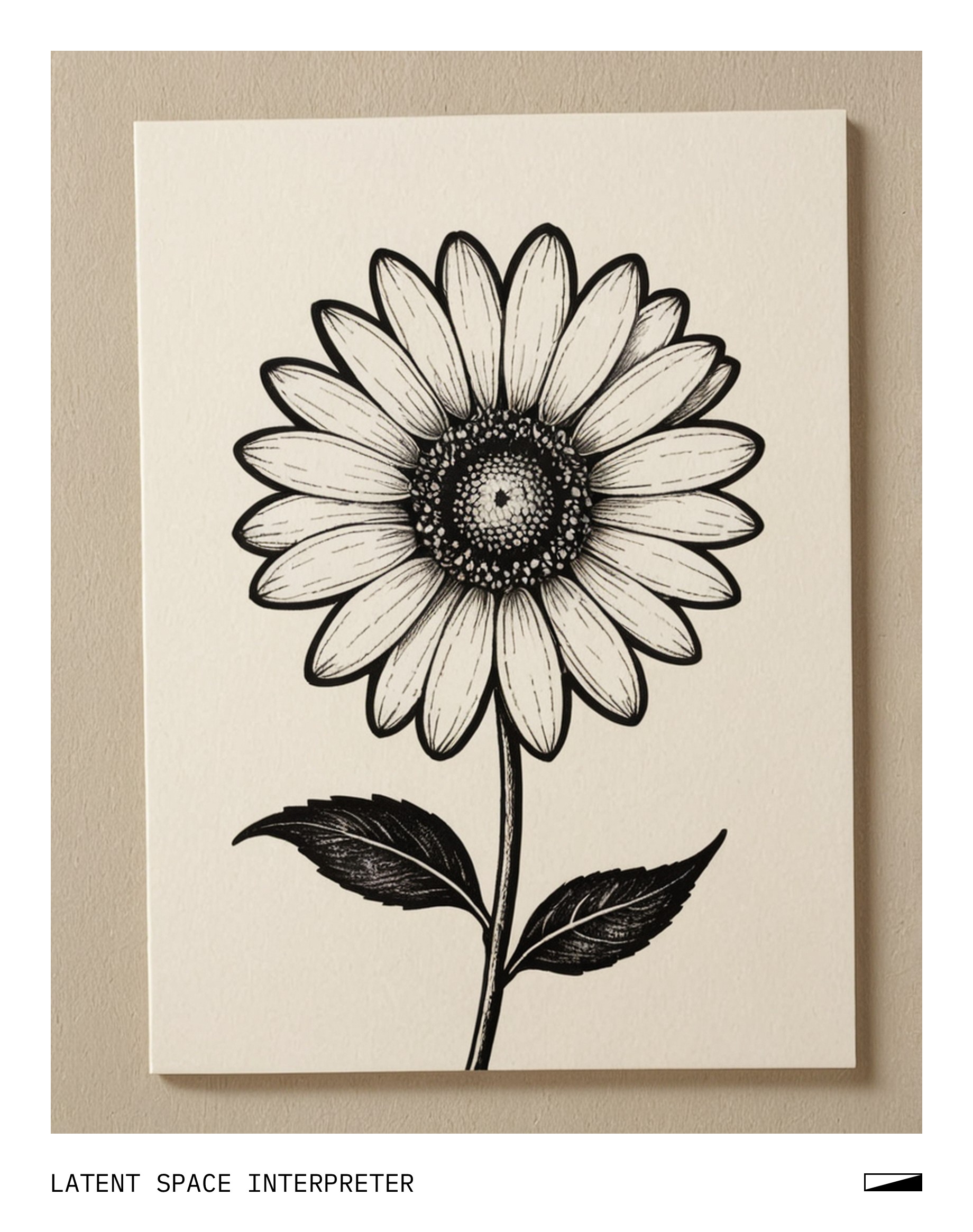 The image features a white paper with a black flower drawn on it, resembling a daisy. The drawing is placed near the center of the paper and appears to be a simple yet elegant design. The paper seems to have been used as a canvas for artistic expression or perhaps as a decorative element.