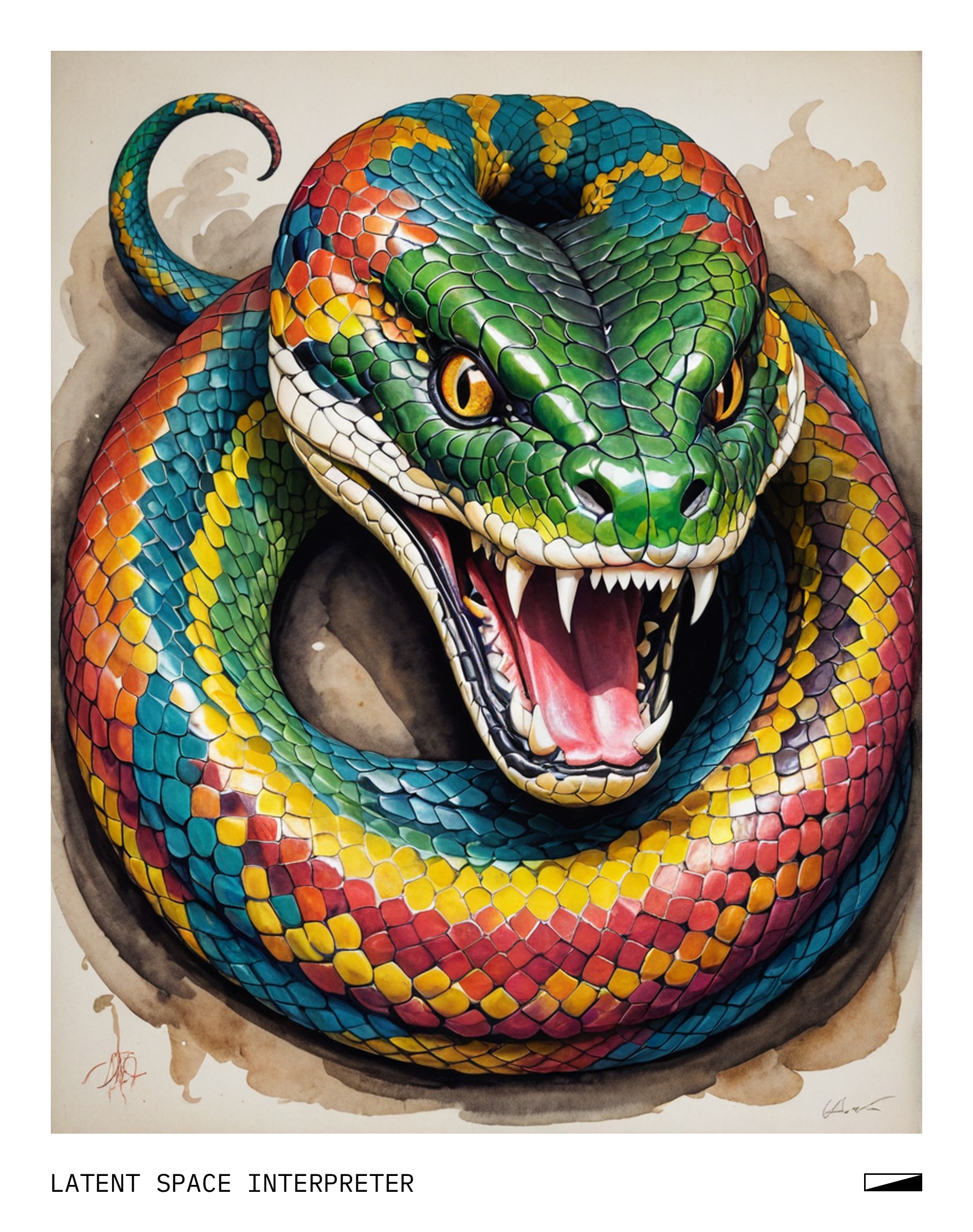 The image features a large, colorful snake with its mouth open and teeth visible. It appears to be drawn or painted on paper, giving it a unique and artistic appearance. The snake's body is curled up, creating a striking visual effect. The drawing captures the essence of the snake's menacing presence while showcasing its vibrant colors.