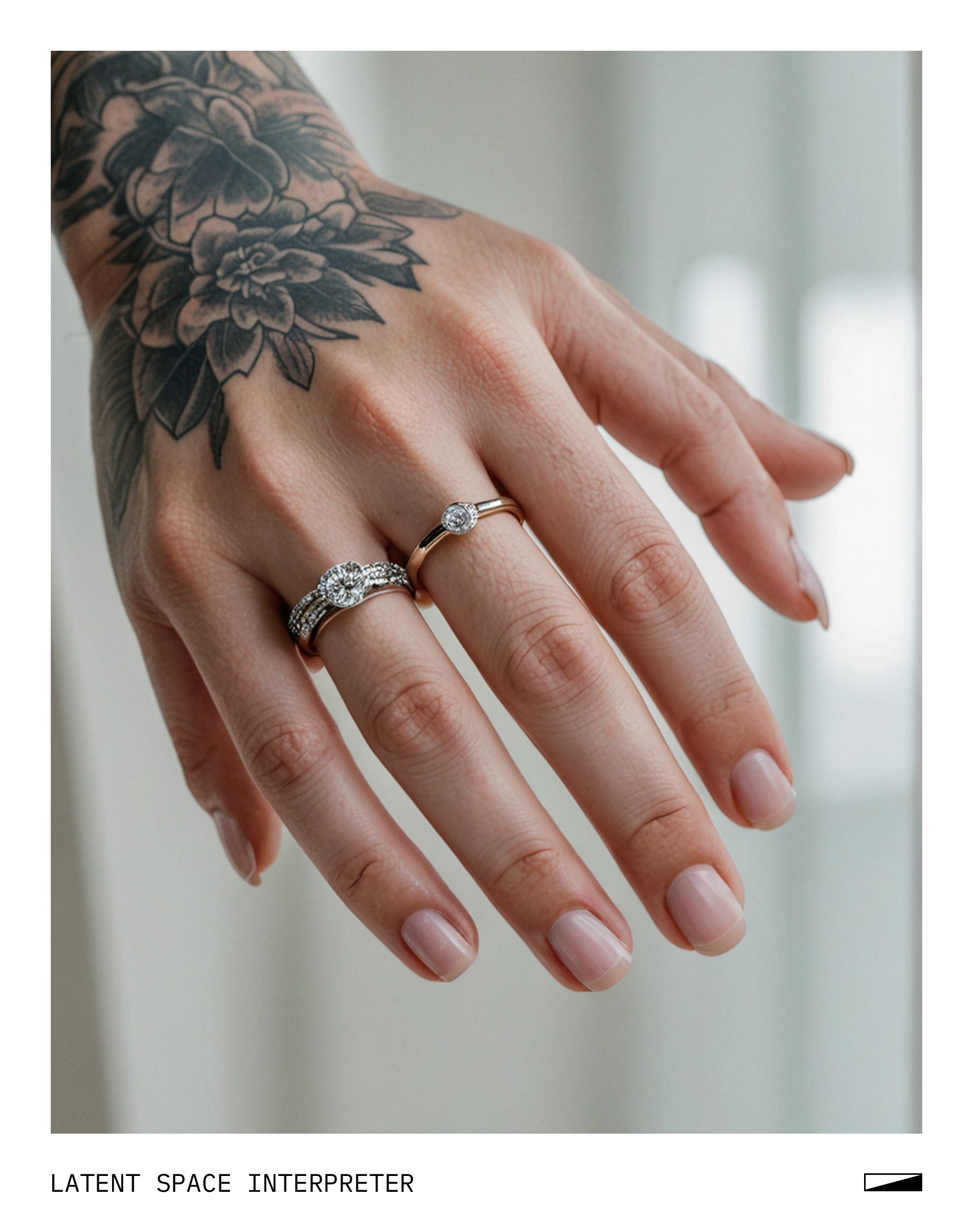 The image features a person's hand with multiple rings on their fingers, including a wedding ring. The hand is positioned close to the camera and appears to be captured through a glass surface, giving it a slightly distorted appearance. The person has a tattoo on their finger, adding a unique touch to their overall look.