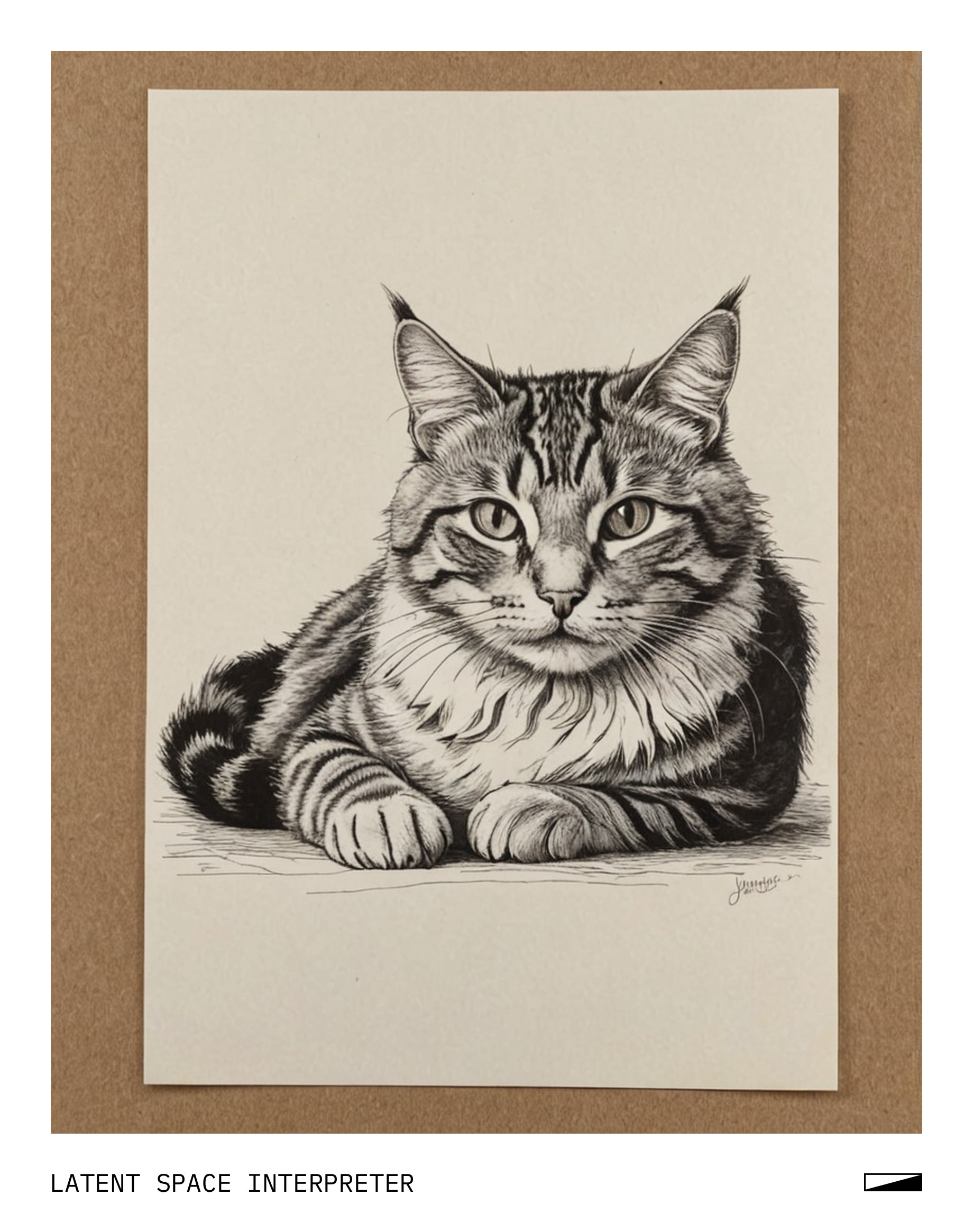 The image features a hand-drawn picture of a cat on a piece of paper, which is placed on top of another piece of paper. The drawing captures the essence of a cat with its distinctive ears and whiskers. The cat's body appears to be curled up or sleeping, giving it a cozy and relaxed appearance.