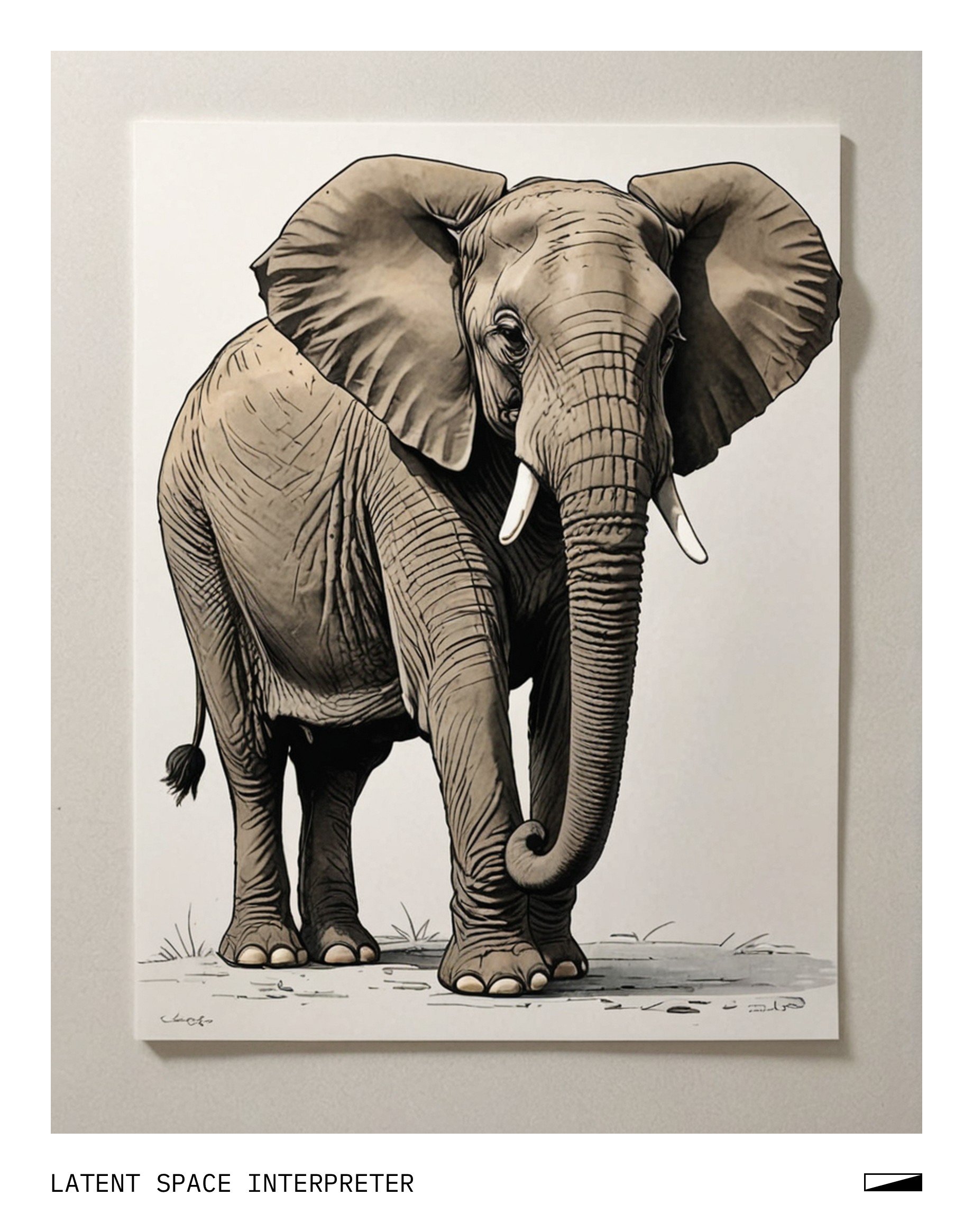 The image features a drawing of an elephant on a piece of paper, which is placed against a white wall. The elephant appears to be standing with its trunk up, giving the impression that it's lifting something or interacting with its environment. The drawing itself has a somewhat sketchy appearance, adding character and charm to the scene.