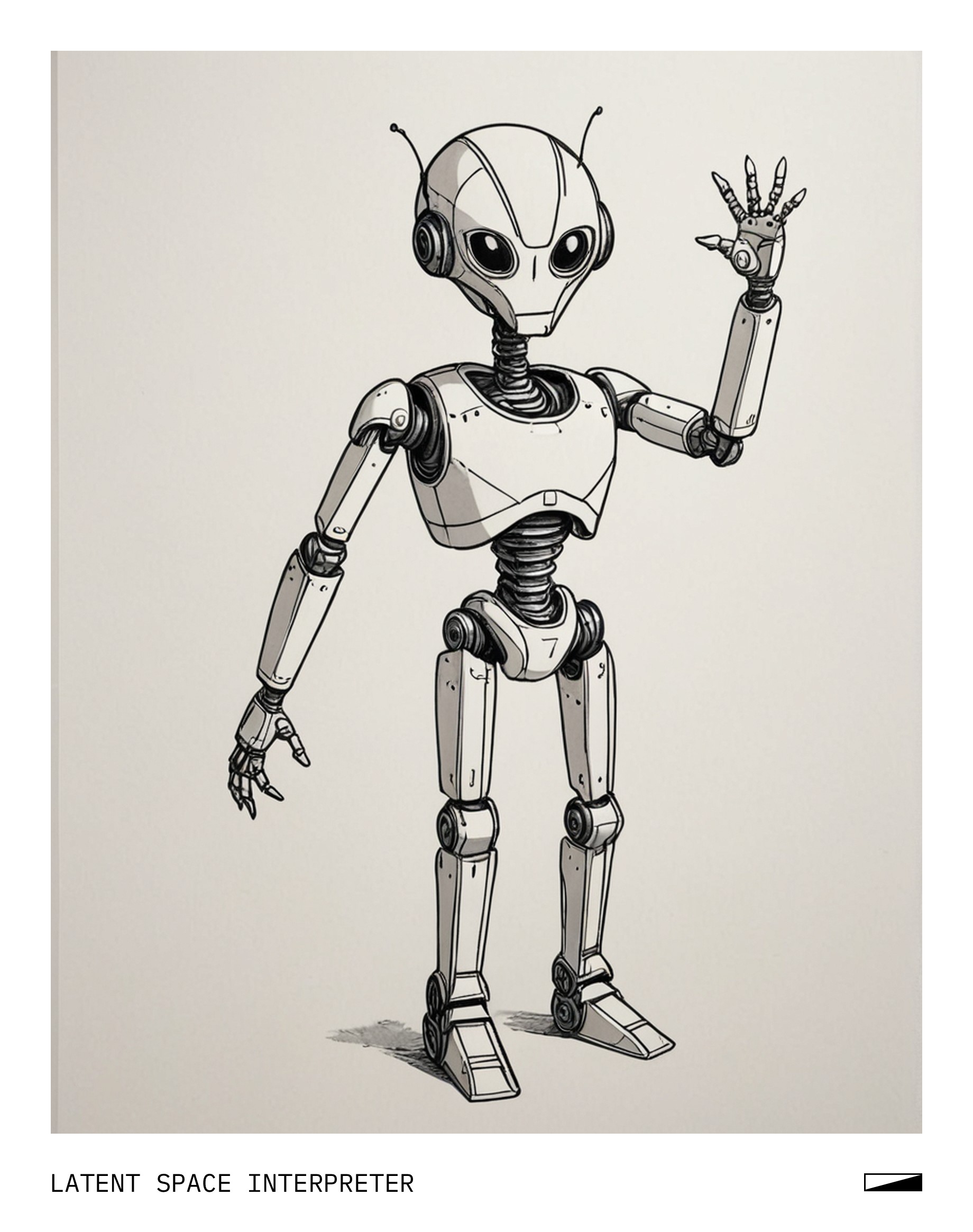 The image features a creative drawing of a robot or alien figure, possibly drawn by a child. It is depicted on a piece of paper that has been placed on the wall. The robot appears to be standing and holding its arms out, giving it a dynamic pose. The paper itself seems to be white, providing a clean background for the artwork.