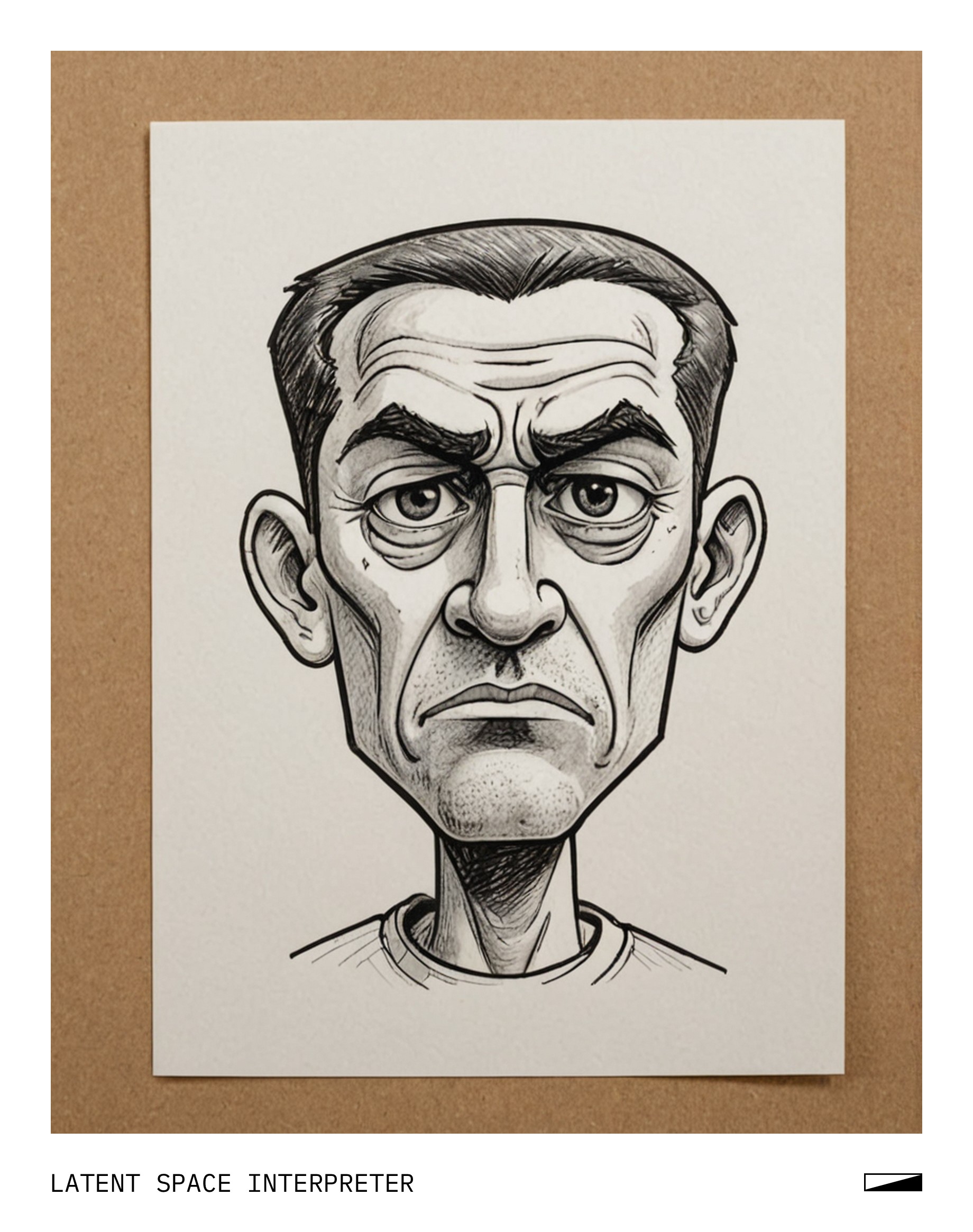 The image features a drawing of a man with a frowning expression, giving the impression that he is unhappy or displeased. The drawing appears to be a cartoon-like representation of a person's face, and it is placed on top of a piece of paper. The overall scene gives off a sense of humor and creativity, as the artist has chosen to depict a character with such a distinctive facial expression.
