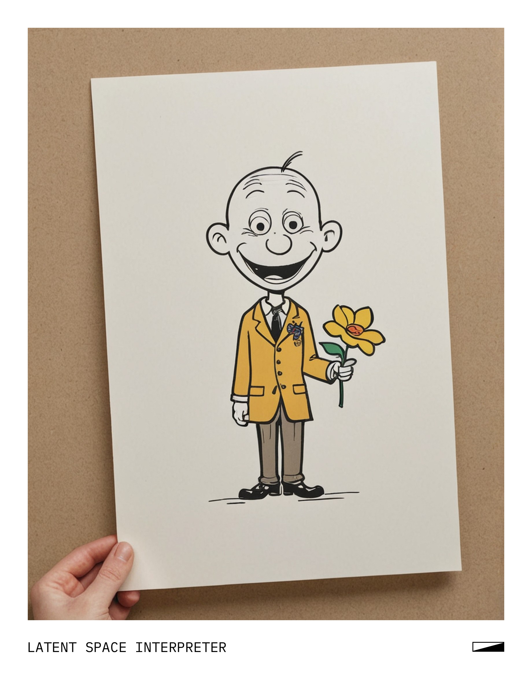 The image features a cartoon drawing of a character holding a flower, possibly a caricature or a comical representation of a person. The drawing is placed on top of a piece of paper that covers the entire frame. The paper appears to be white and has been used as a canvas for the artwork.