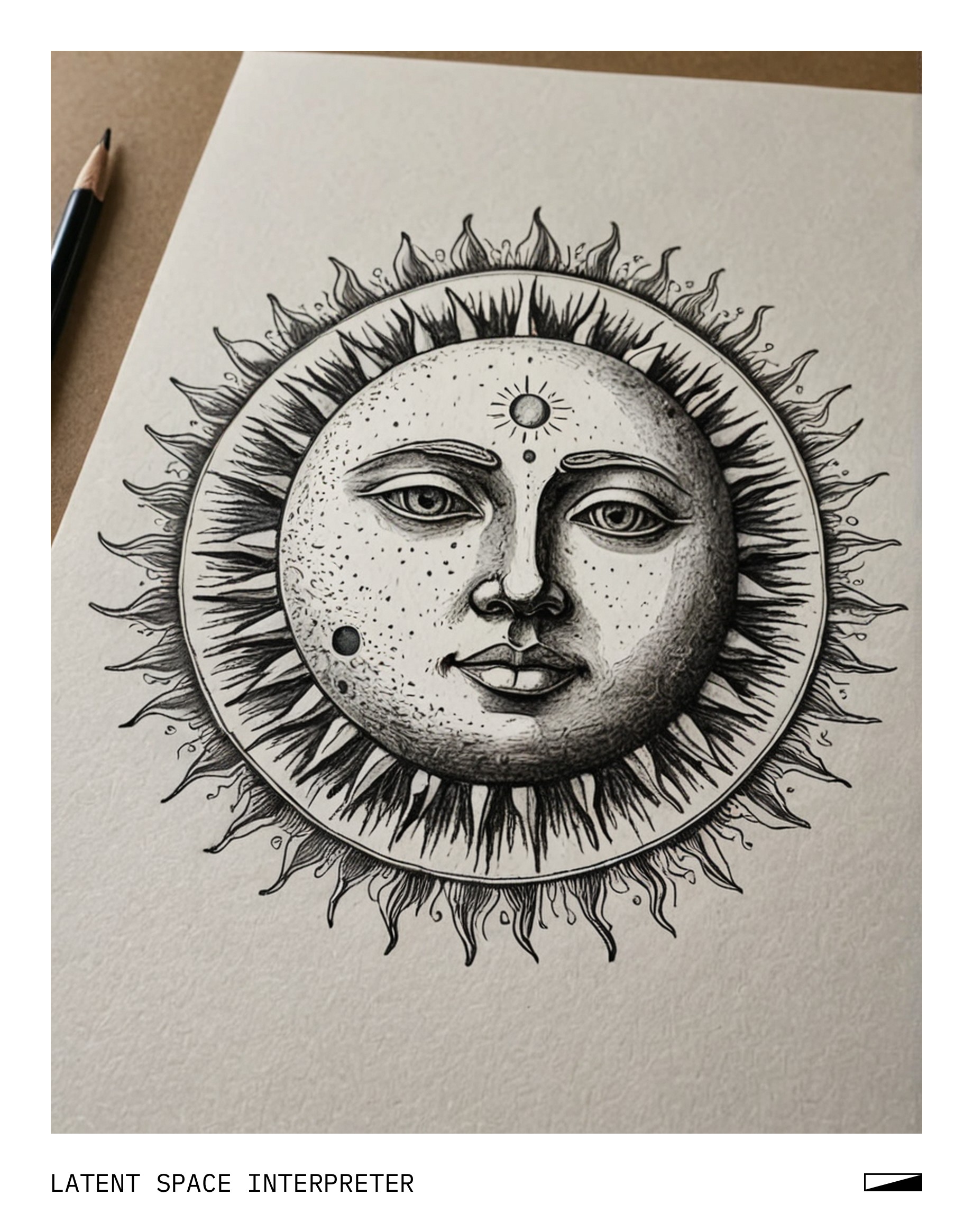 The image features a drawing of the moon and sun on a piece of paper, with the moon positioned above the sun. The drawing is quite detailed, capturing both celestial bodies' shapes and sizes accurately. The paper appears to be white, providing a clean background for the artwork.