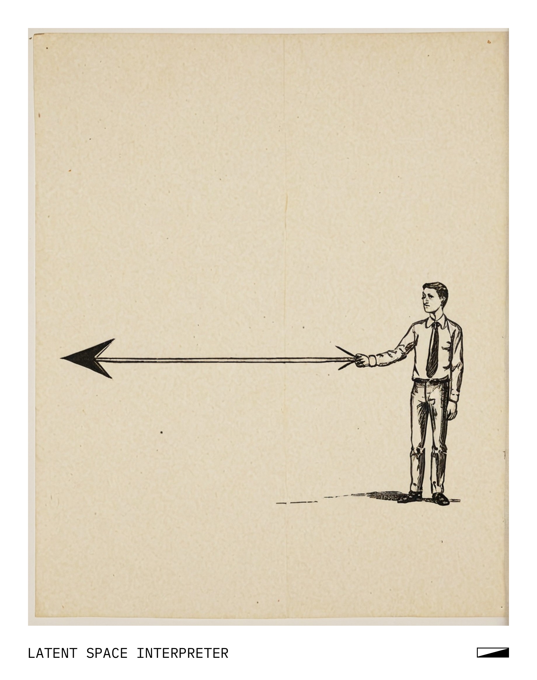The image depicts a large drawing of an arrow pointing rightward, which is likely accompanied by the word "right" underneath it. This illustration is found on a piece of paper or a white board, situated next to some other sheets of paper. Additionally, there is another smaller drawing of a man located near the top left corner of the main picture.