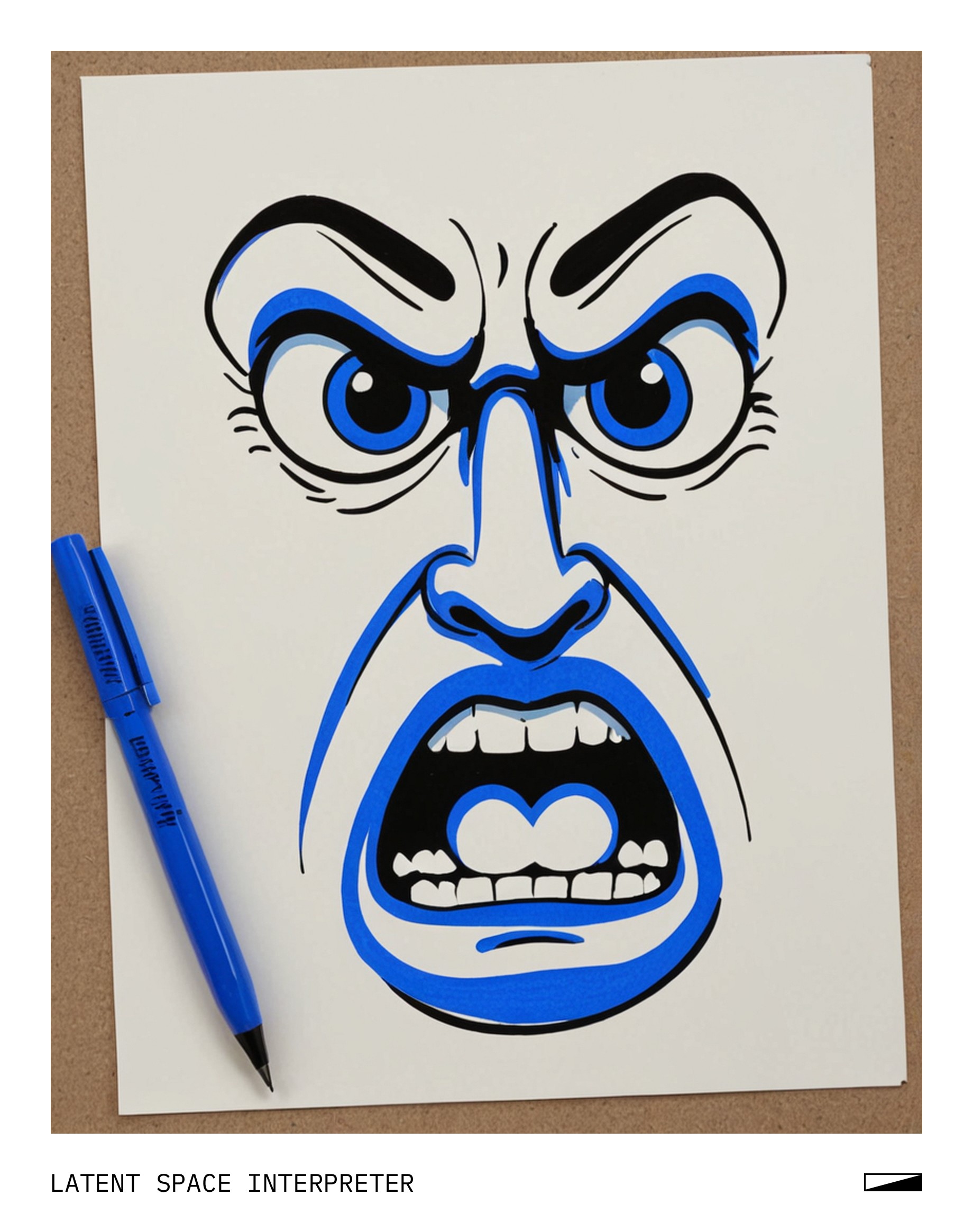 The image features a white board with a face drawn on it, specifically an angry-looking cartoon character or possibly a person making a funny face. There is a blue pen placed near the drawing, indicating that someone was likely using it to create the artwork. The image appears to be a close-up of the face design, capturing its details and expression.