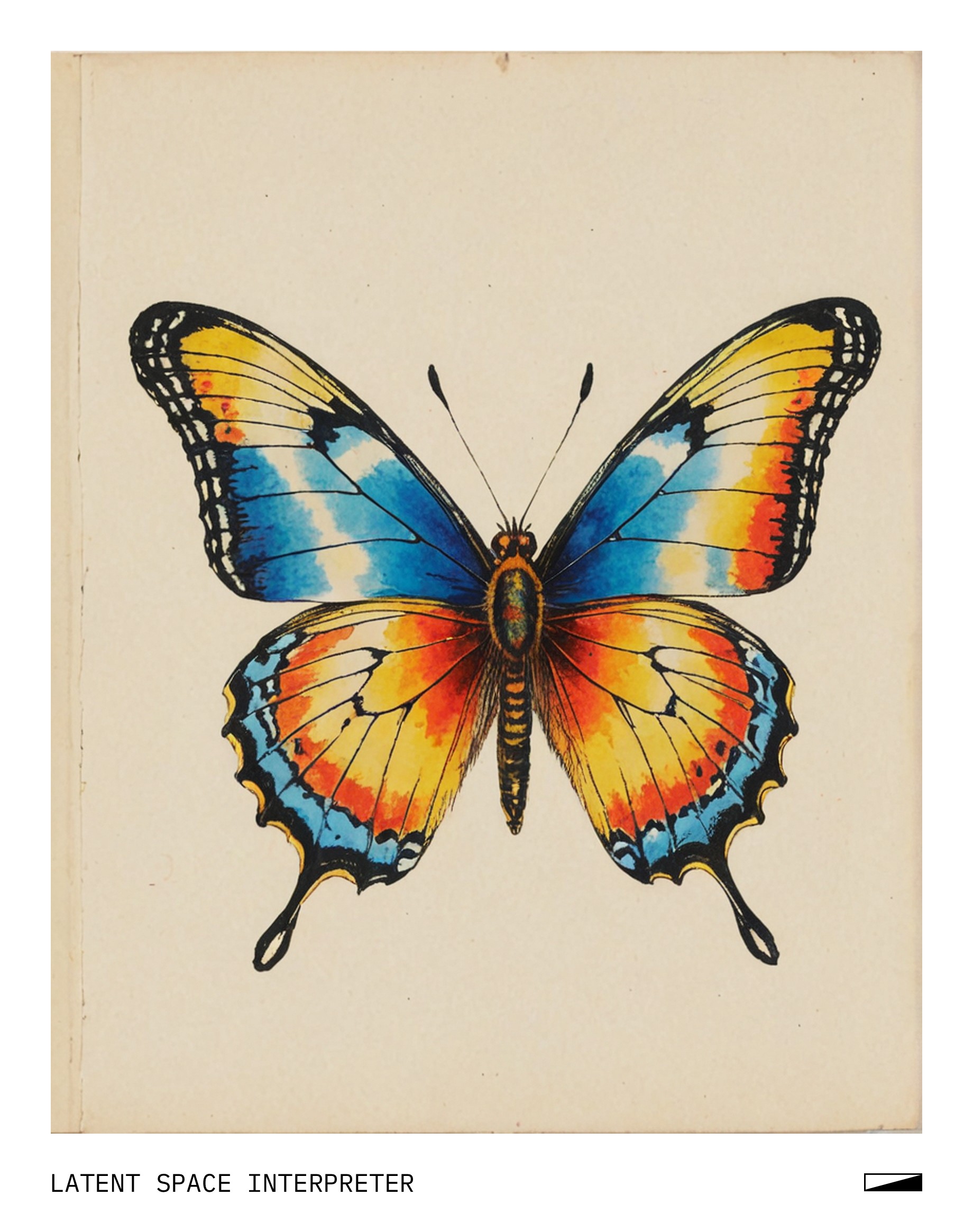 The image features a colorful butterfly drawn on a piece of paper, with its wings spread out across the page. The butterfly is positioned towards the left side of the paper and appears to be the main focus of the drawing. There are also several smaller circles scattered around the paper, possibly representing other elements or decorations within the scene.