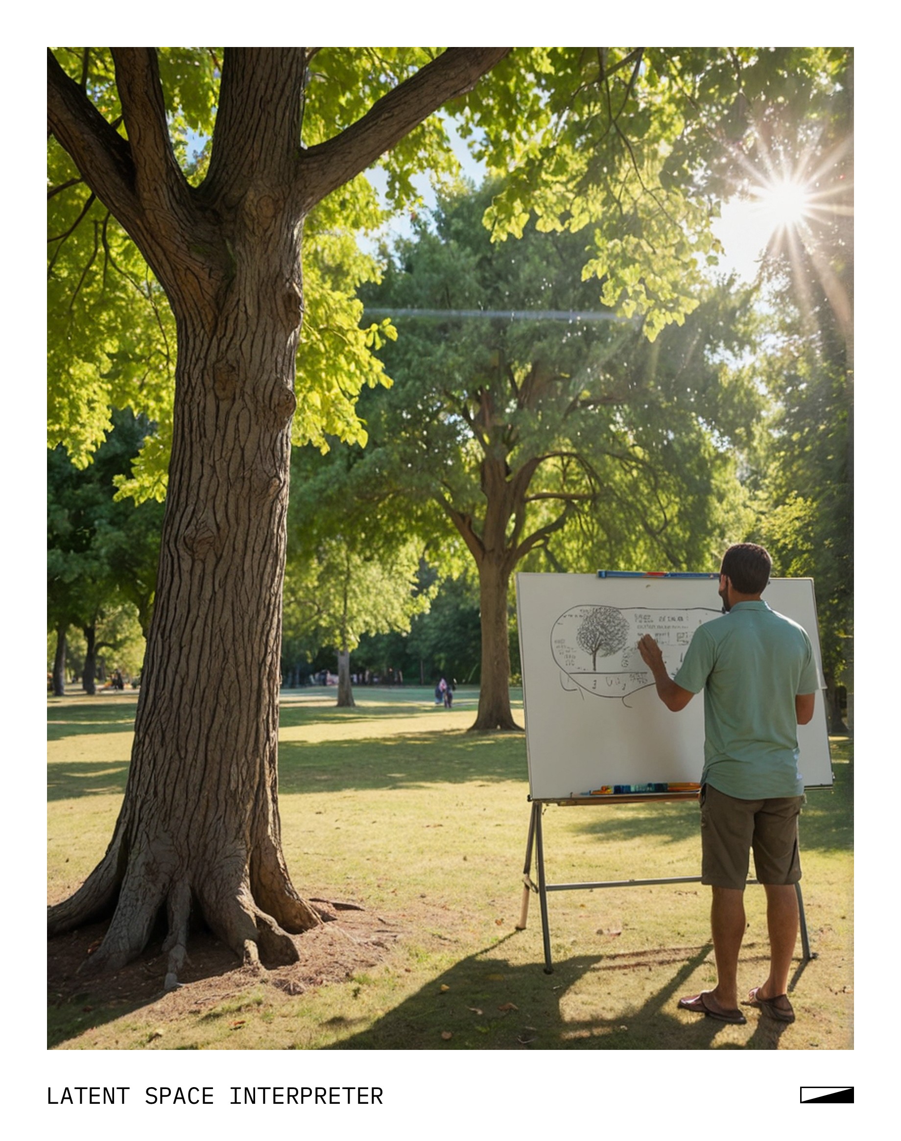 The image features a whiteboard with two drawings of trees and the sun on it. One drawing is located towards the left side, while the other is positioned more centrally. A person can be seen standing underneath one of the trees, possibly enjoying the shade or taking shelter from the sun. The scene appears to depict a pleasant outdoor setting where someone has drawn the elements of nature to create a visually appealing composition.