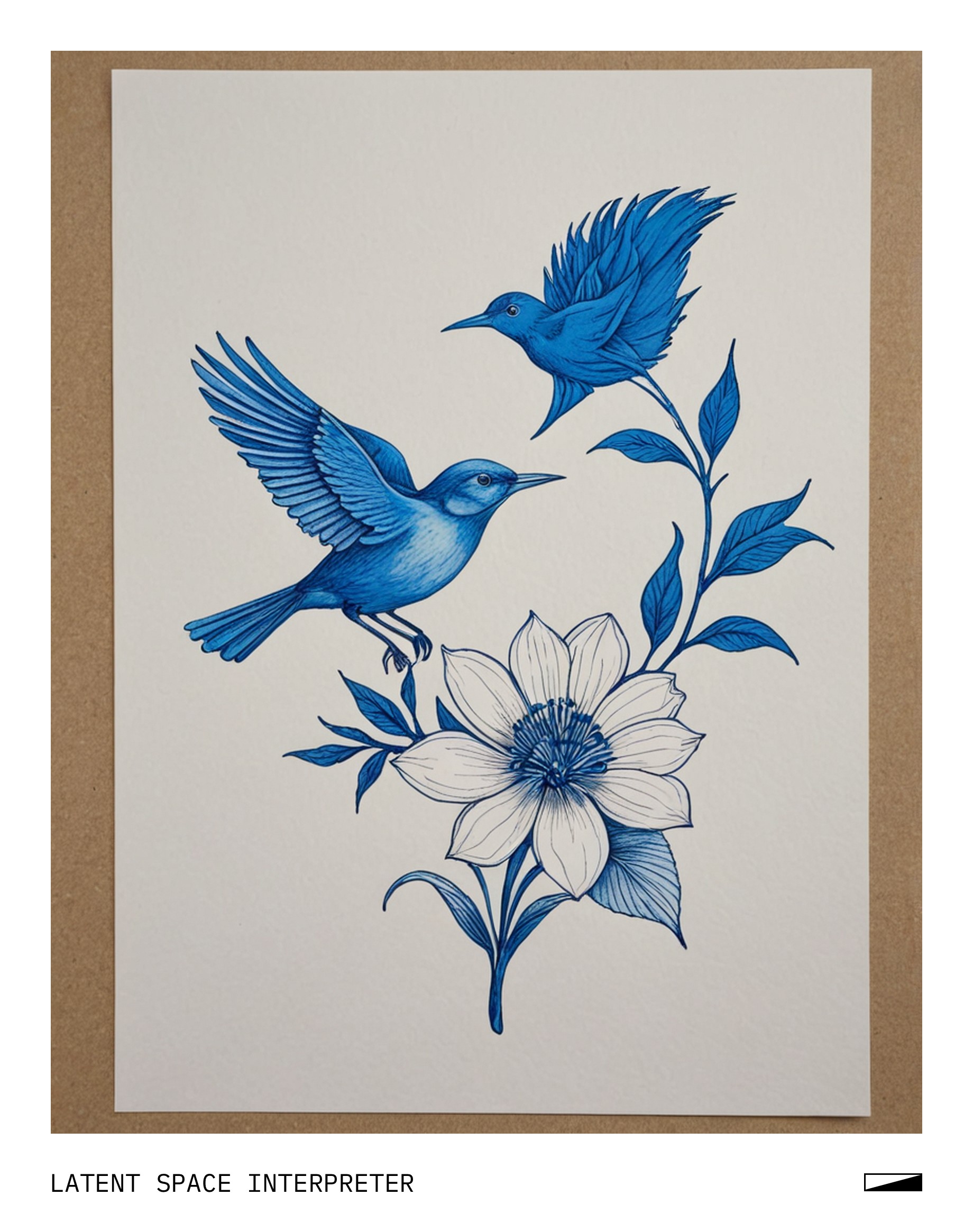 The image features a white piece of paper with a blue drawing of a flower and a bird on it. The flower is positioned towards the center, while the bird is located slightly to the left side of the drawing. The artwork appears to be done by hand, giving it a unique and personal touch.
