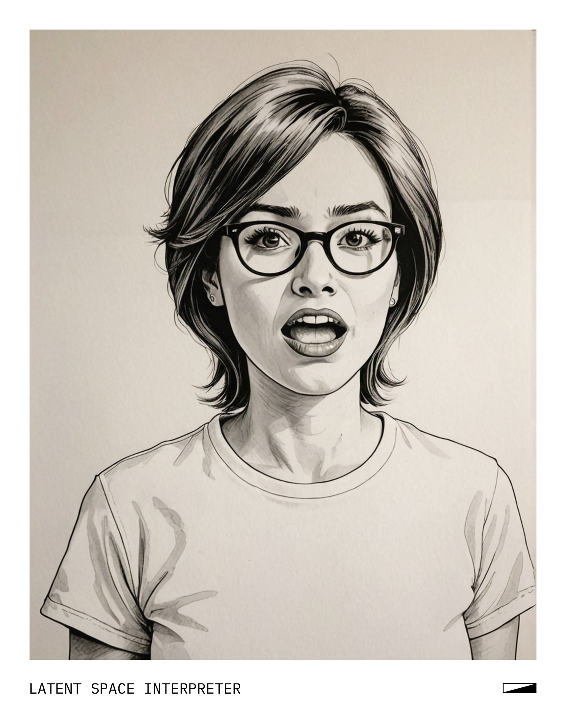 The image features a drawing of a woman with glasses, likely a cartoon or caricature. She is wearing a white shirt and has her mouth open as if she's talking. The drawing appears to be done by hand, giving it a unique and personal touch.