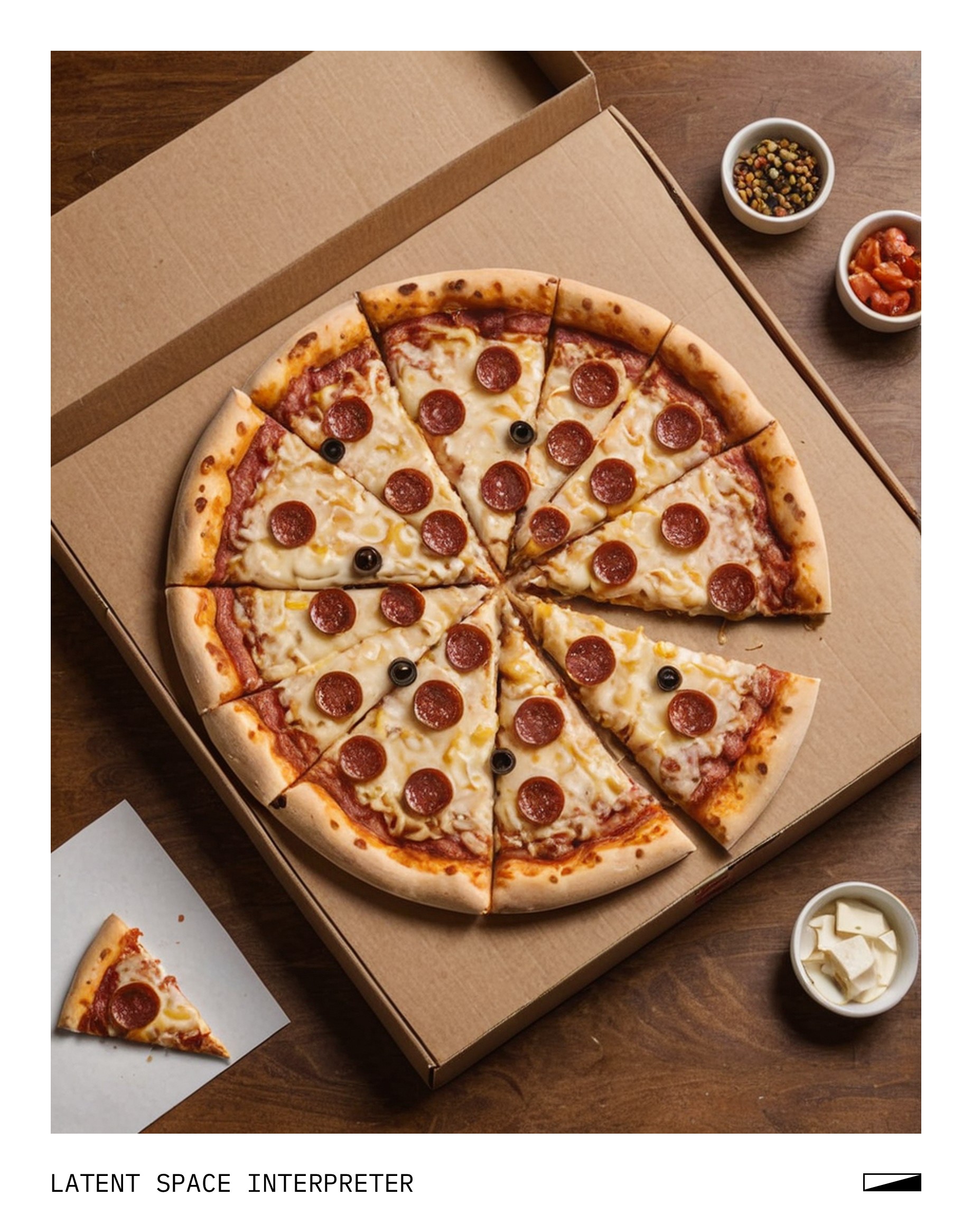 The image features a pizza with only three slices remaining on the paper, placed next to a brown box. The pizza is topped with various cheese pieces that have been artistically drawn by someone using a pen or marker. The cheese appears slightly melted as if it has just been served, giving a realistic presentation of the pizza slices.