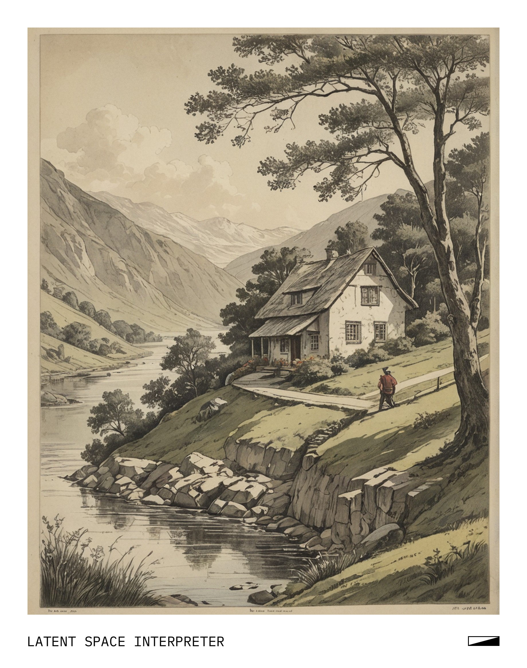The image features a drawing of a small house, likely a cottage, situated near the edge of a hillside or mountainside. Beside the house, there is a tree and a river, creating a picturesque scene. The image also includes a person standing close to the house, possibly enjoying the beautiful view or admiring the surroundings.