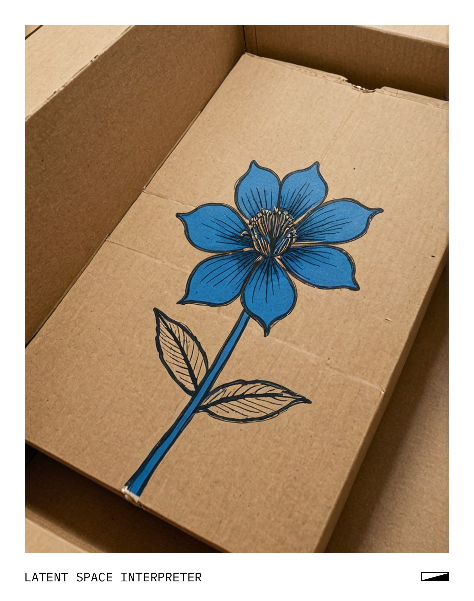 The image features a piece of paper with a blue flower drawn on it, possibly a sketch or a doodle. The drawing is placed on top of another piece of paper, which appears to be a cardboard box. The scene seems to be set indoors, as the lighting suggests that the picture was taken inside a room.