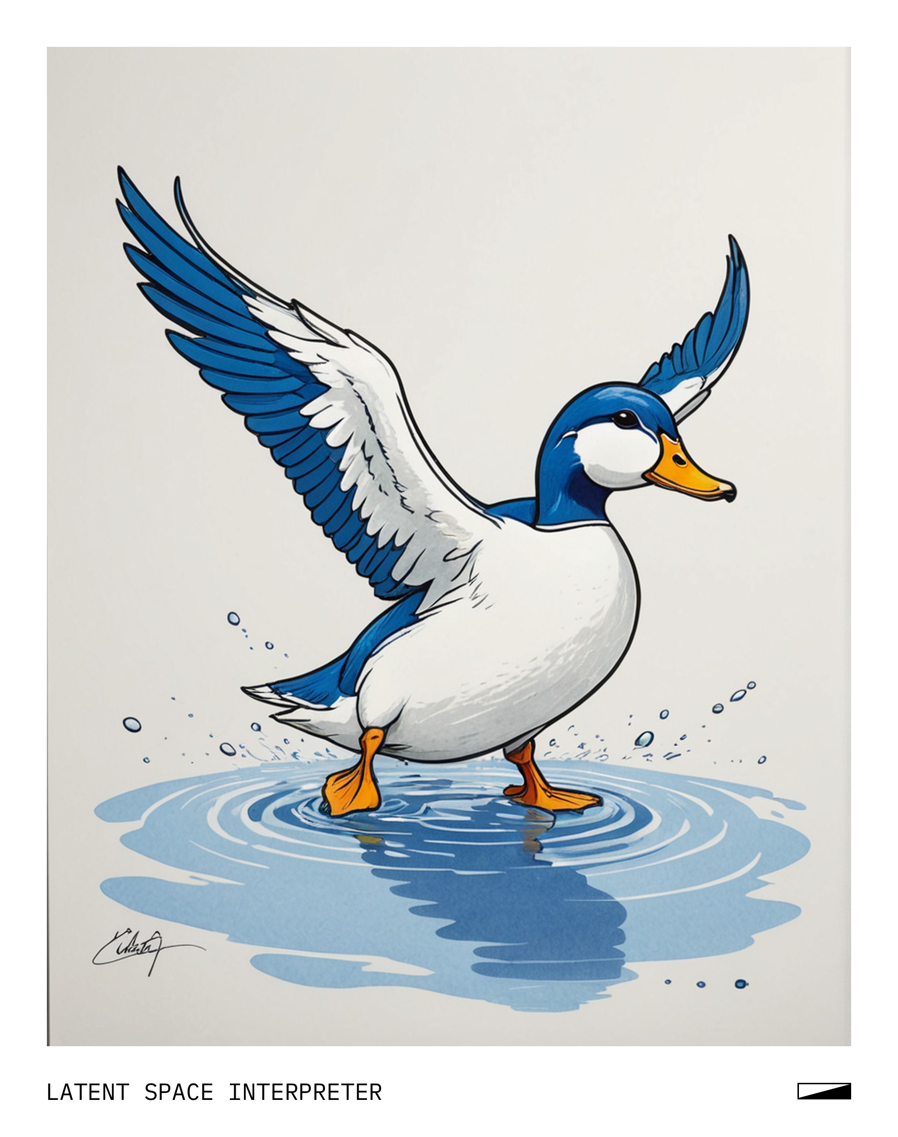 The image features a white background with a blue duck drawn on it, giving the impression of a cartoon or comic-like scene. The duck is positioned towards the left side of the image and appears to be floating above the surface. The drawing captures the essence of a duck's body shape, including its head, neck, wings, and tail.
