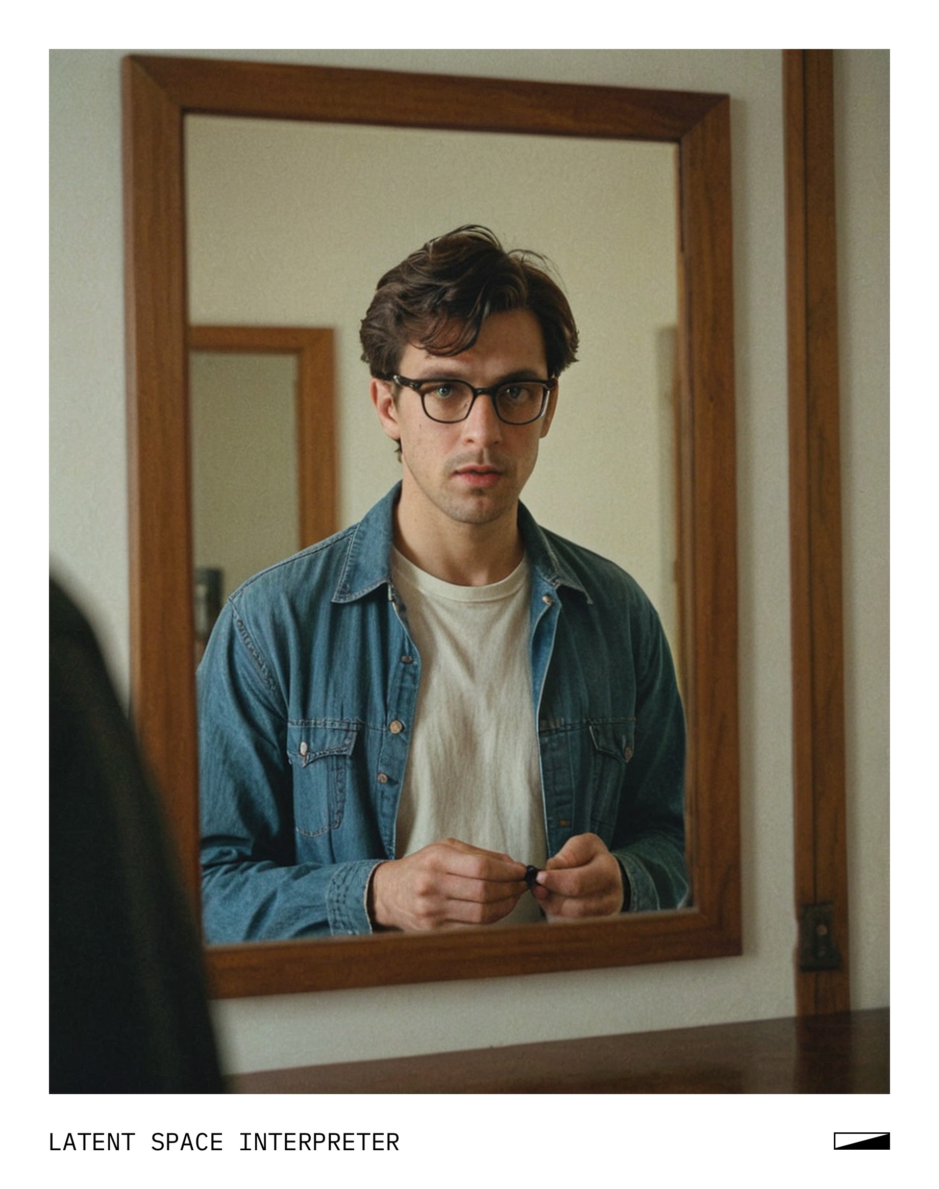 The image features a man wearing glasses, standing in front of a mirror and looking at his reflection. He appears to be focused on the mirror as he observes himself. The scene takes place indoors with a dining table visible in the background.