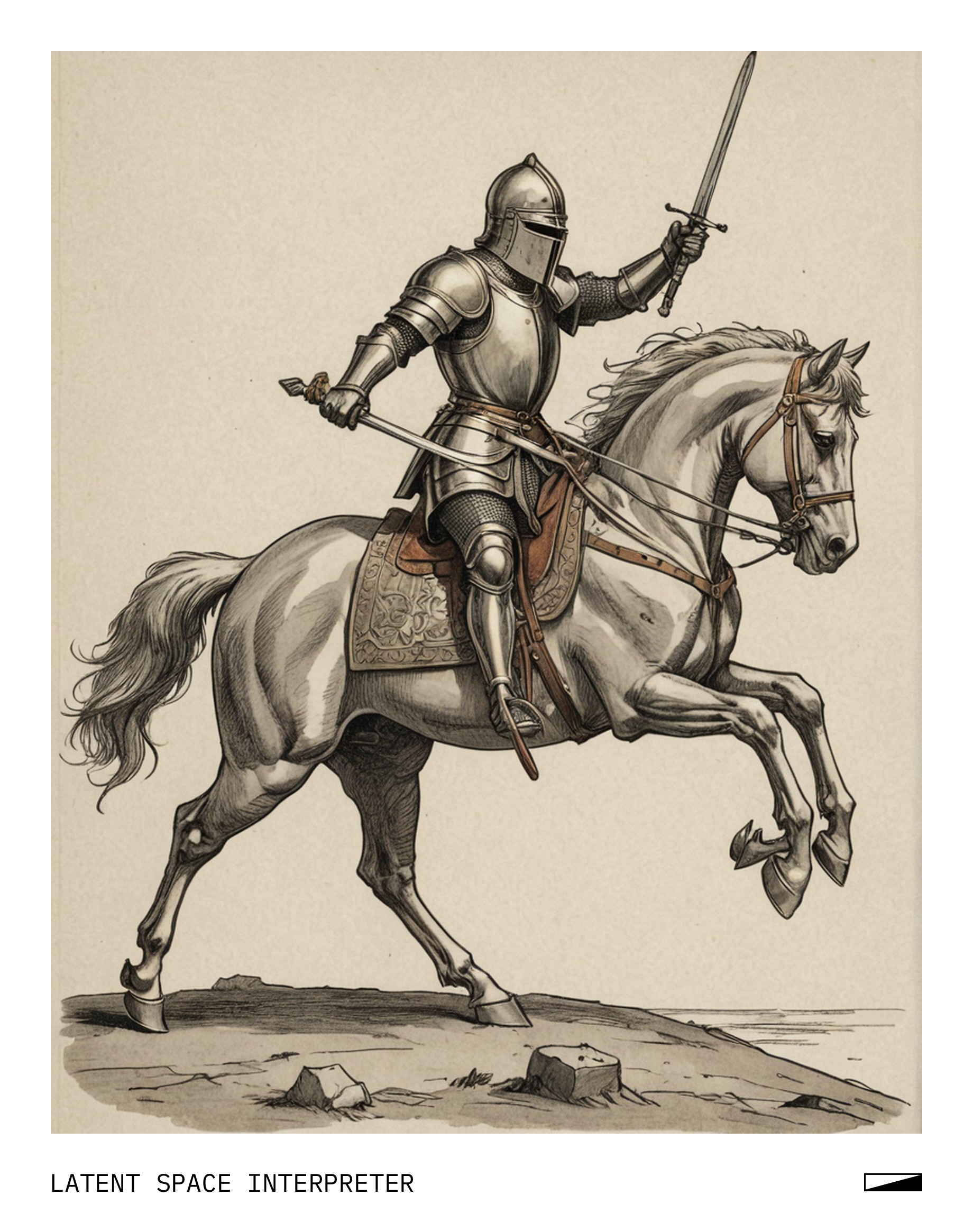 The image features a drawing of a knight riding a horse on the back of a white piece of paper or cardboard. The knight is holding a sword, and there is also a cross visible in the scene. The horse appears to be galloping, adding motion to the illustration. The overall composition creates an artistic representation of a medieval-inspired theme.