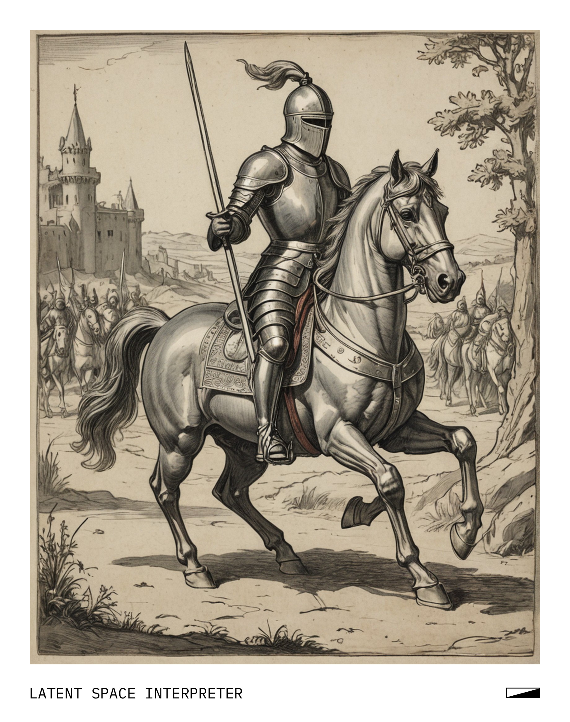 The image features a drawing of a knight on horseback, possibly a religious figure or a warrior. The knight is depicted riding the horse with a sword in hand, ready for battle. The horse itself appears to be positioned towards the left side of the scene. The drawing is quite detailed and captures the essence of the knight's appearance and the horse's stance.