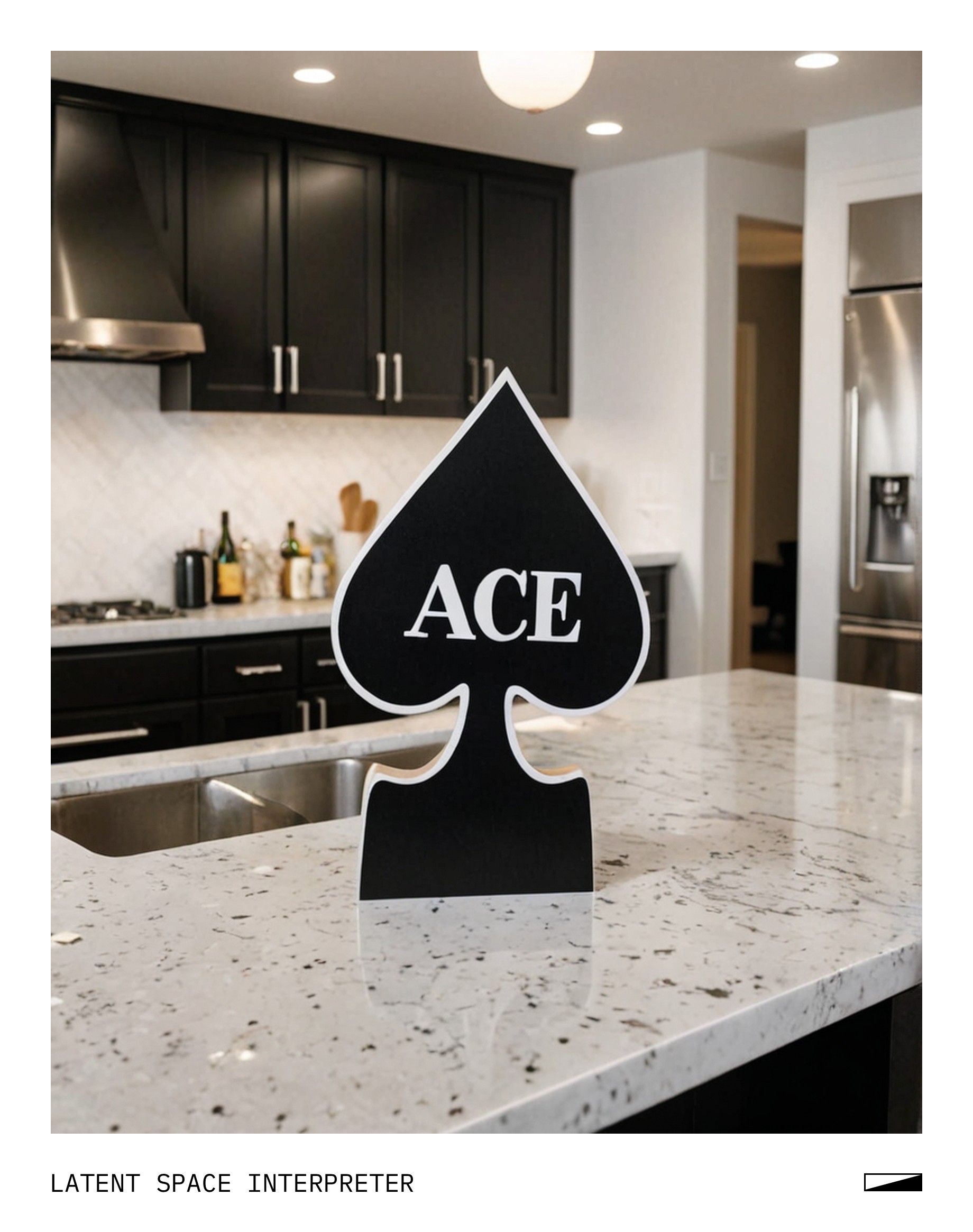The image features a large cardboard cutout of a black and white spade, which is placed on top of a table or counter. Above the spade, there is a sign that reads "Ace of Spades." This unique decoration adds a touch of elegance to the space it occupies.