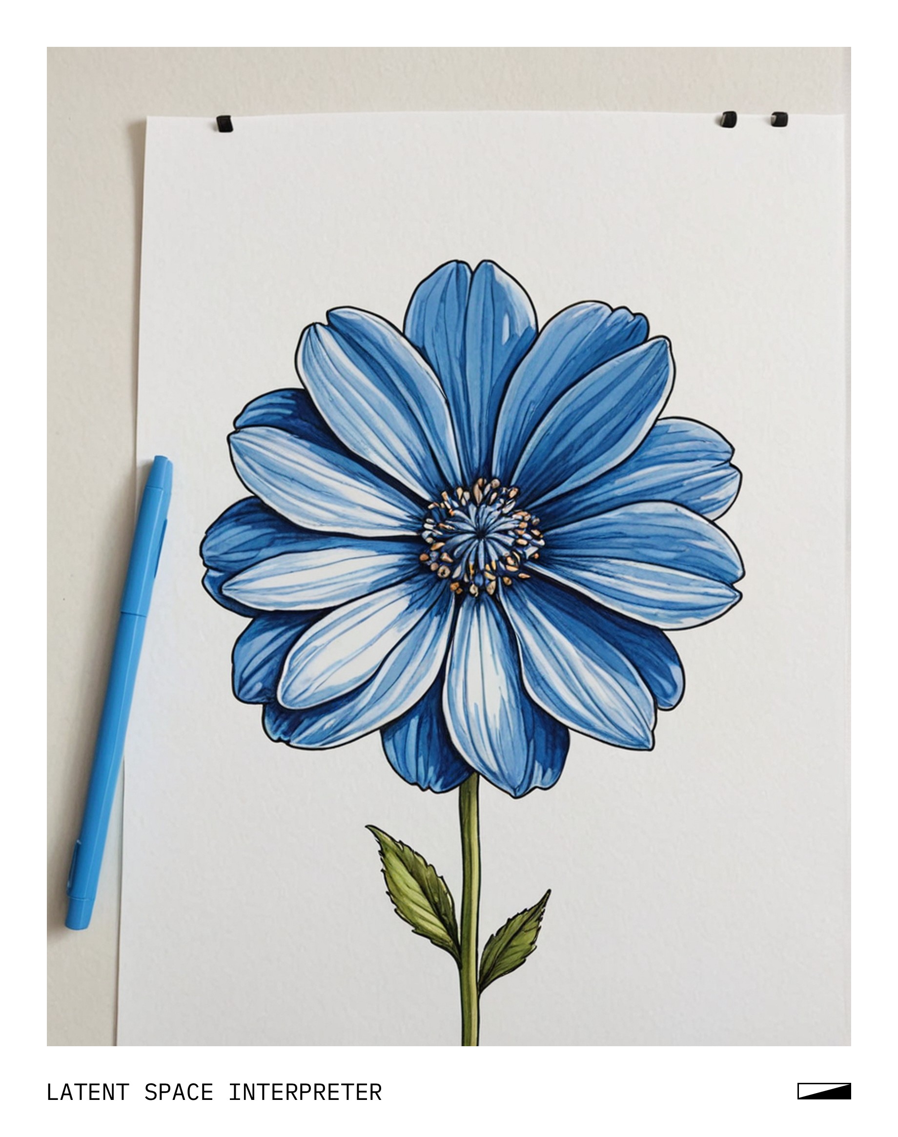 The image features a white background with a blue flower drawn on it, likely using a marker or pen. The flower is placed towards the center of the scene and appears to be a simple design. The overall composition creates an artistic and visually appealing display.