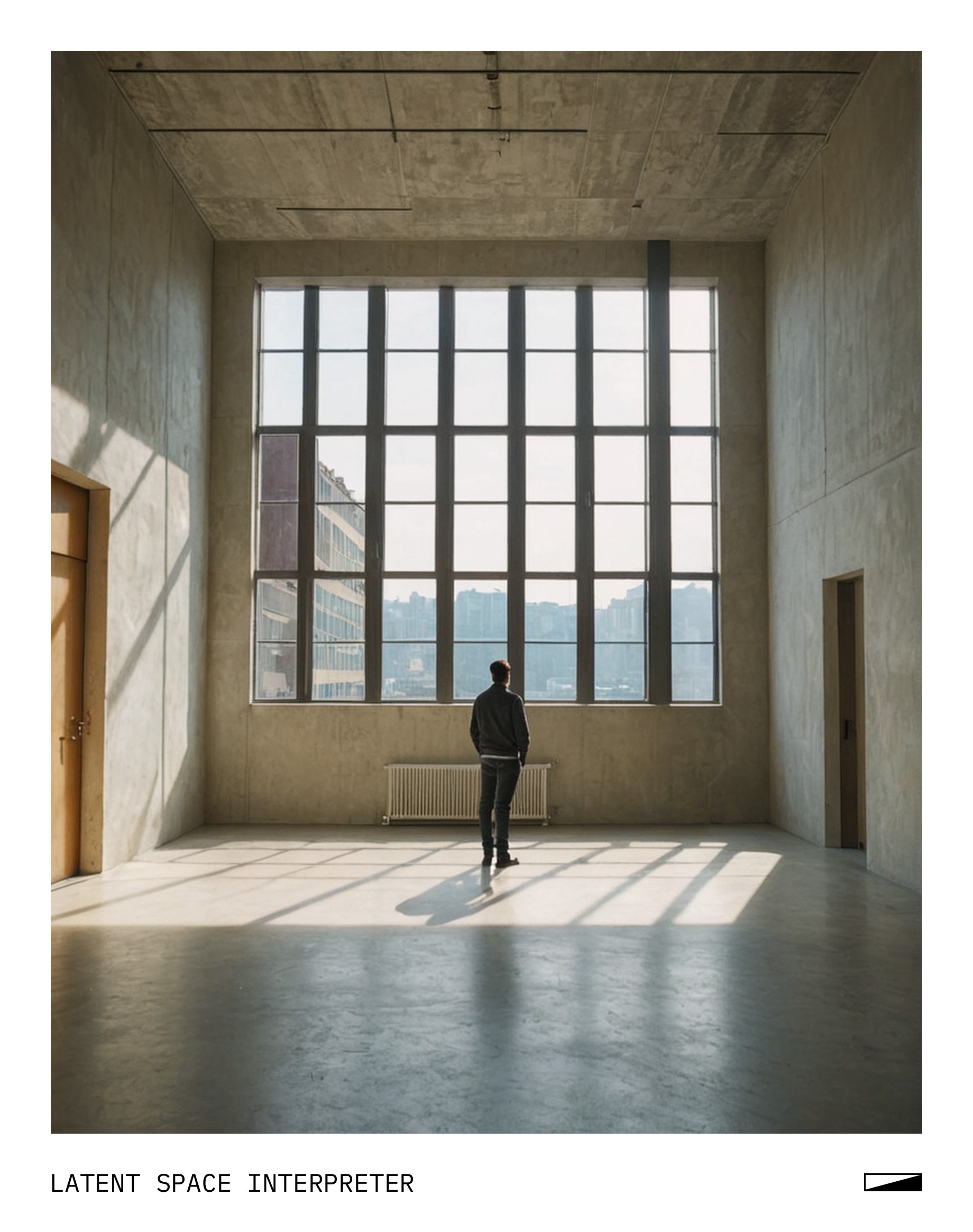 The scene is set inside a building with a bright window that illuminates the area. Above, there is a sunlit window that casts light onto the room's interior. The space appears to be quite spacious and open, featuring large windows and a ceiling. There is a person present in the middle of the room, possibly observing or interacting within the environment.