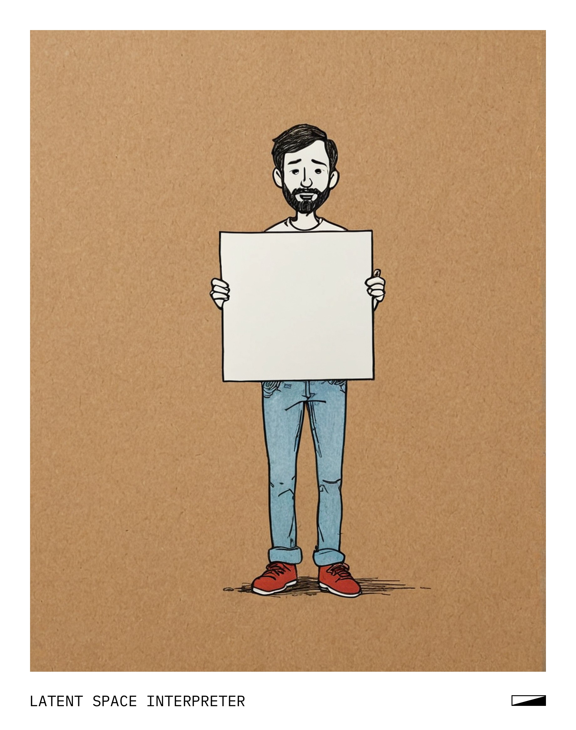 The image depicts a hand-drawn cartoon picture of a person standing alone within a square frame. The drawing is on a piece of paper or cardboard, which is placed against the wall. The artwork appears to be a simple sketch of the human figure with no additional elements or background, giving it a minimalist feel. It could be an attempt at humor or an expression of creativity by the artist.