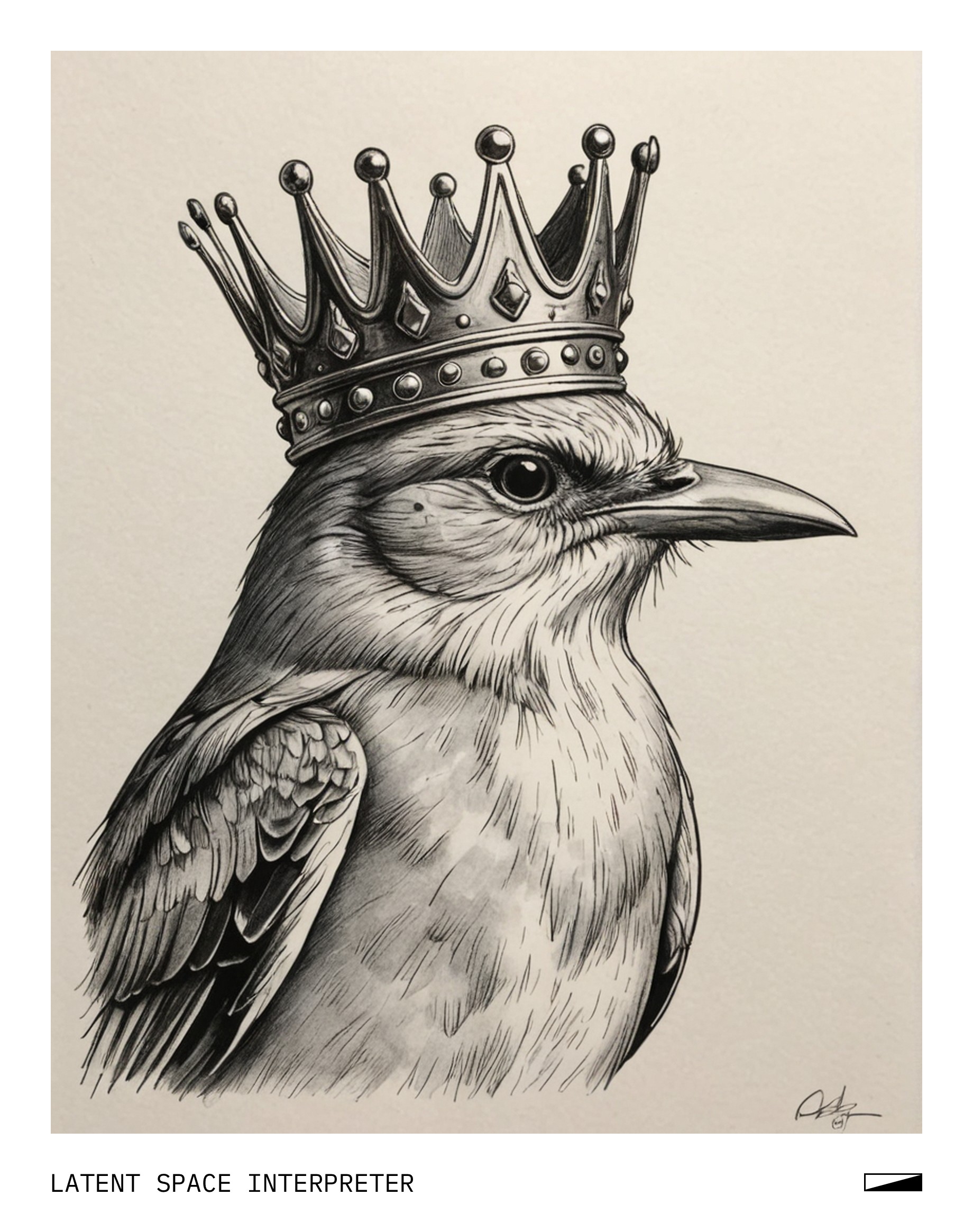 The image features a bird with a crown on its head, likely drawn by someone using a pencil or marker. The bird is positioned towards the left side of the scene and appears to be looking downwards. The drawing captures the bird's unique appearance with the crown on its head, making it stand out as a creative piece of artwork.