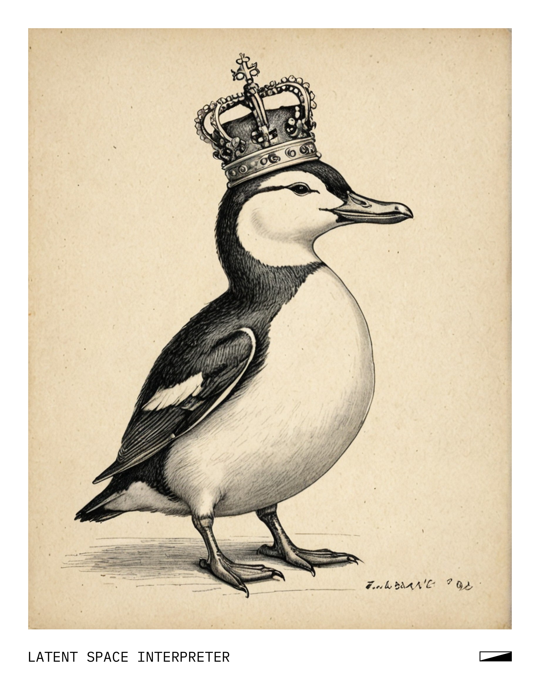 The image features a drawing of a bird, possibly a penguin or a duck, with a crown on its head. The bird is positioned towards the left side of the picture and appears to be wearing a royal-like hat. The drawing seems to be done by hand, giving it a unique and personal touch.